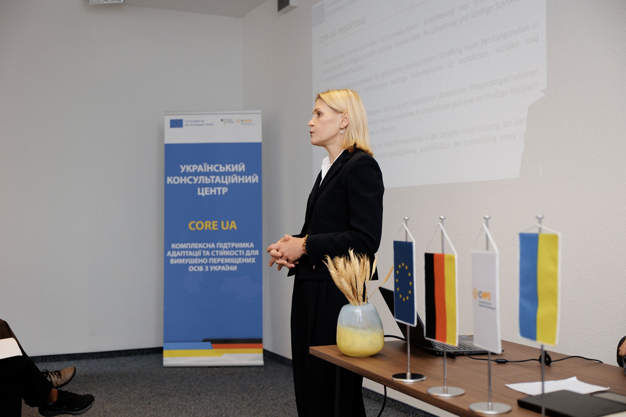 На початку заходу було представлено ширший контекст ініціативи. Команда CORE-UA презентувала проєкт та окреслила роль УКЦ у покращенні доступу до достовірної інформації та підтримки для осіб, тимчасово переміщених з України, у Німеччині. Представники BAMF підкреслили важливість практичних і доступних локальних структур підтримки.